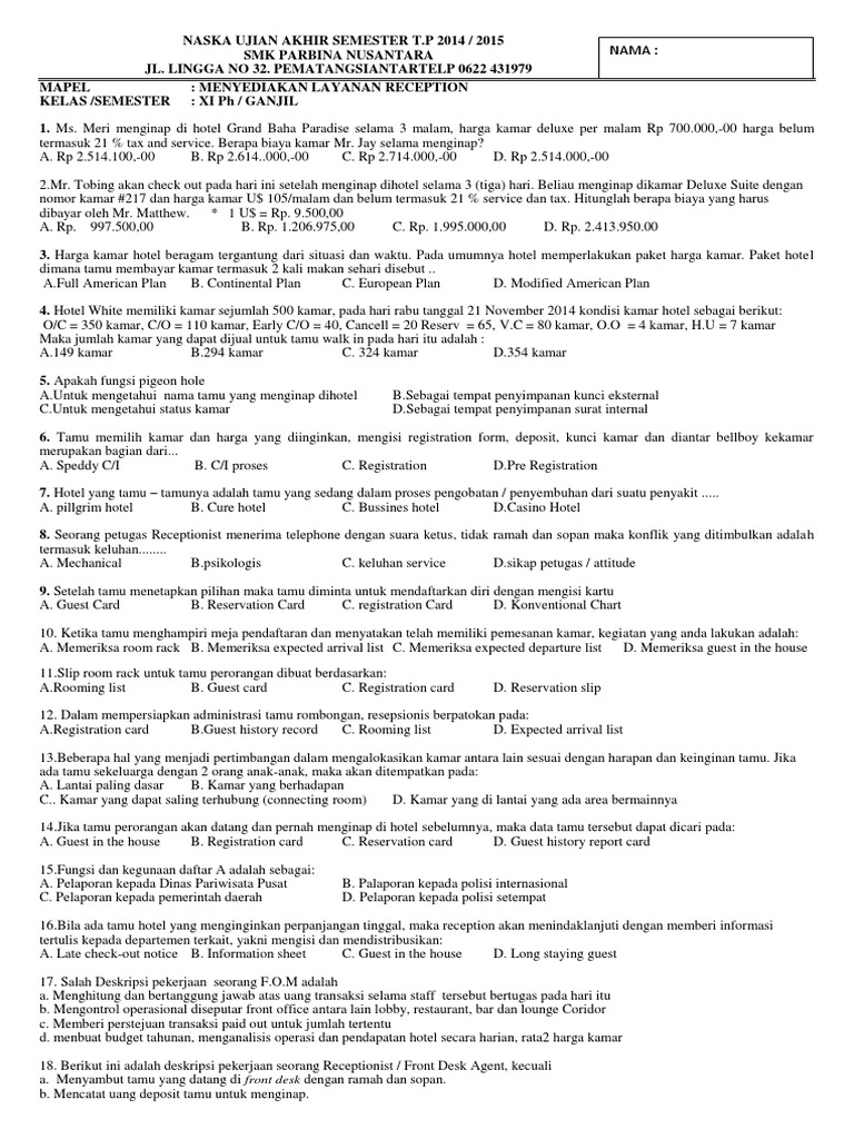 Kumpulan Soal Front Office Kelas Xi Perhotelan Beinyu Com